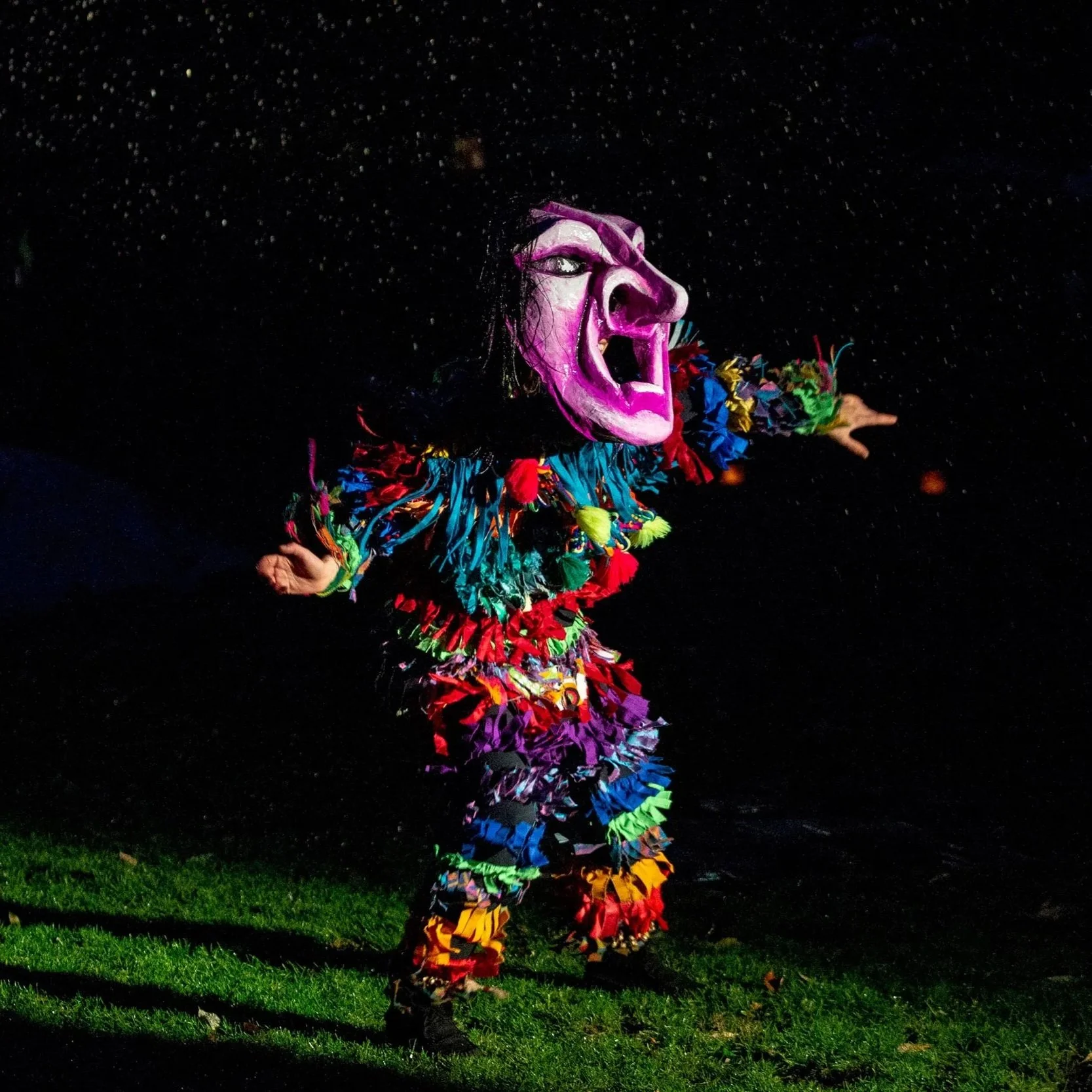 The theatrical procession makes its way to the park’s southern gates on Havelock and proceeds to the soccer field. The main pageant takes place on the soccer field and it is where the main theatrical scenario will be brought to life with volunteers and other performers. The performance space is set up as an oval and is marked by lights placed in bags on the ground. The audience stands around this oval for the performance.